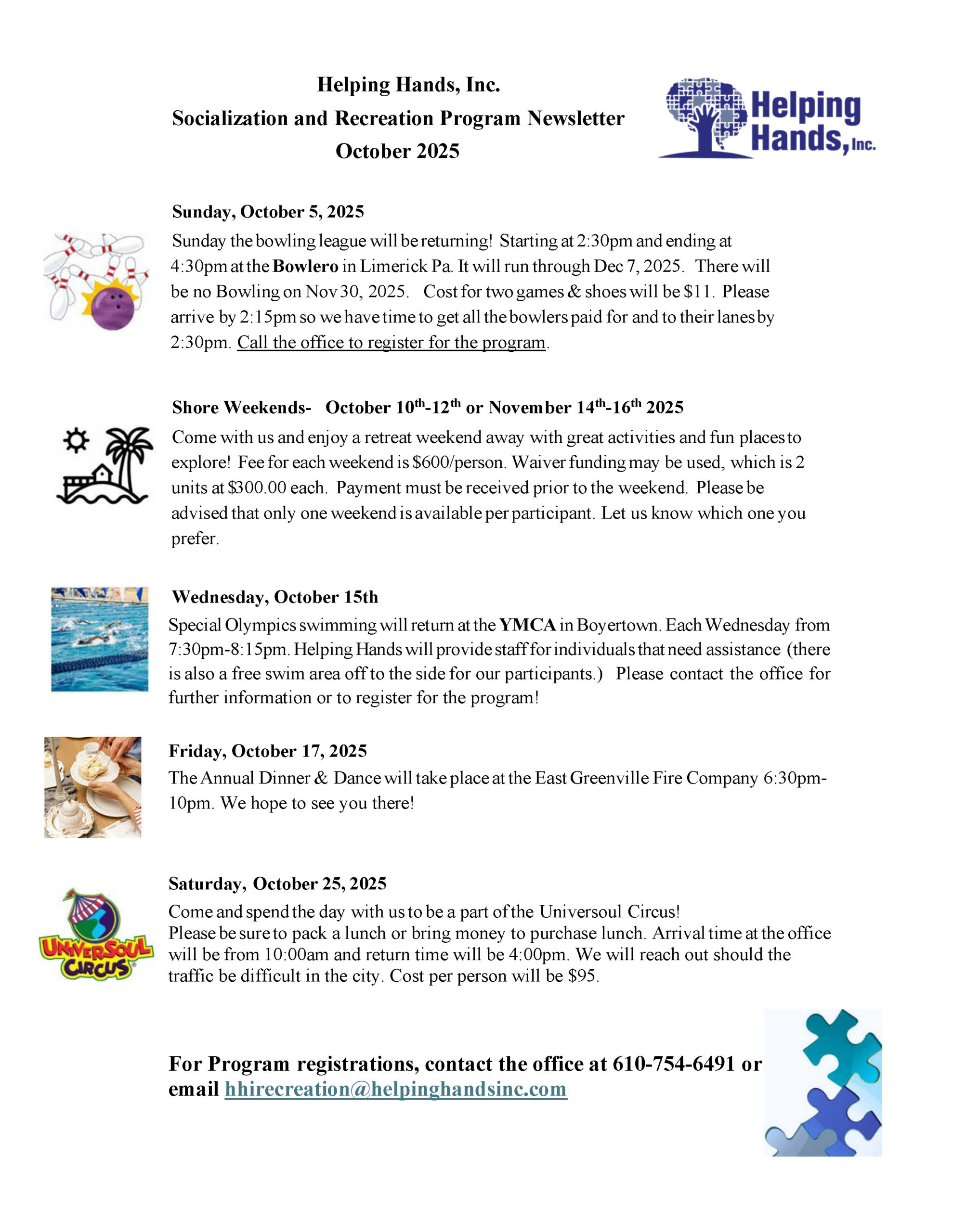 Fees Apply. For more information about this great program, please contact our Director of Socialization & Recreation, Nishairy Diaz at hhirecreation@helpinghandsinc.com.